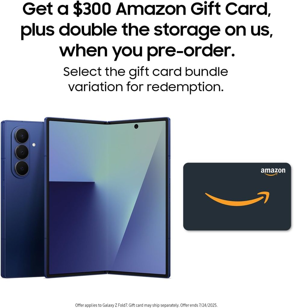 • PRE-ORDER BUNDLE: Get an Amazon Gift Card, plus double the storage on us, when you pre-order Samsung Galaxy Z Fold7. Select the gift card bundle variation for redemption. Gift card may ship separately. Offer ends 7/24.